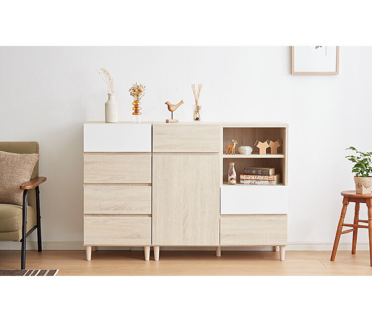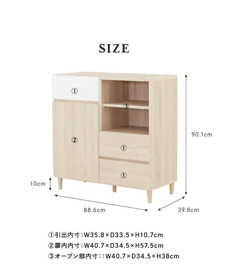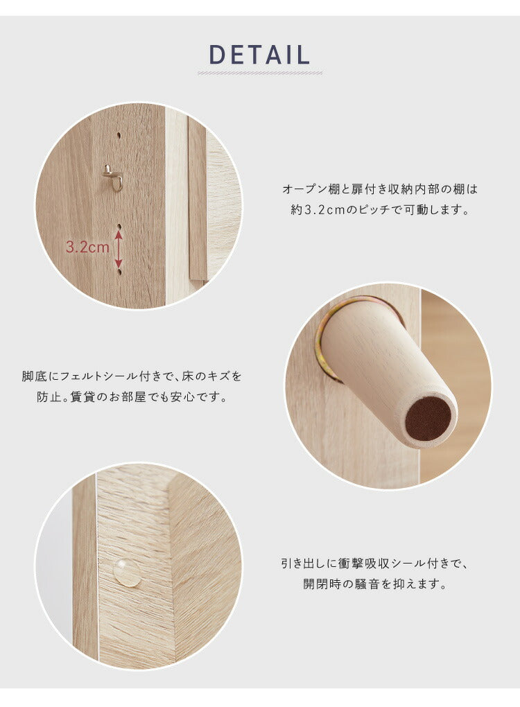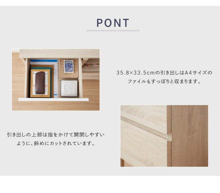 A4サイズが入る引出しや可動棚付きのオープン収納と扉付き収納が付いており、本や雑誌、紙類・文房具などを整理して収納できます。