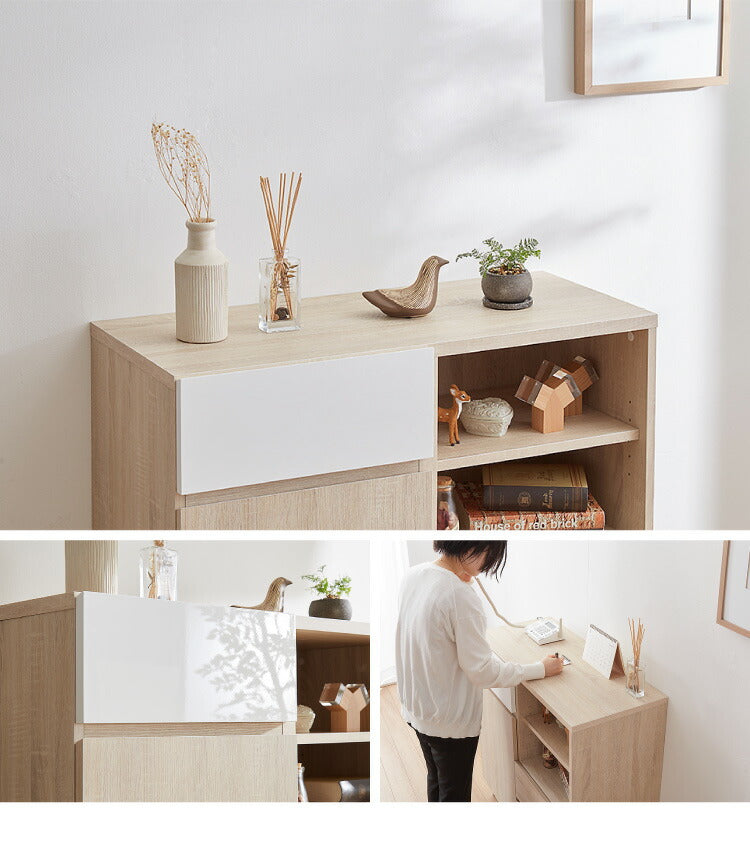 リビングやベッドルームで、テレビ、オーディオ、電話台として使用したり、ワークスペースとしても使いやすい高さとなっています。