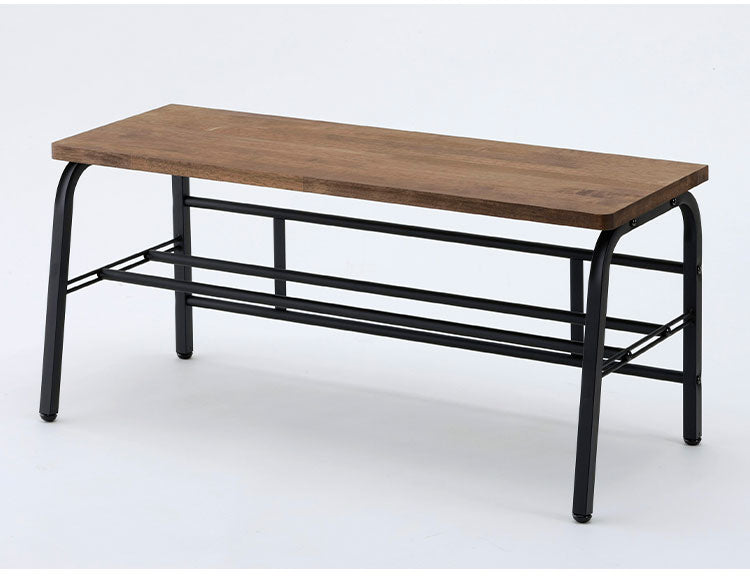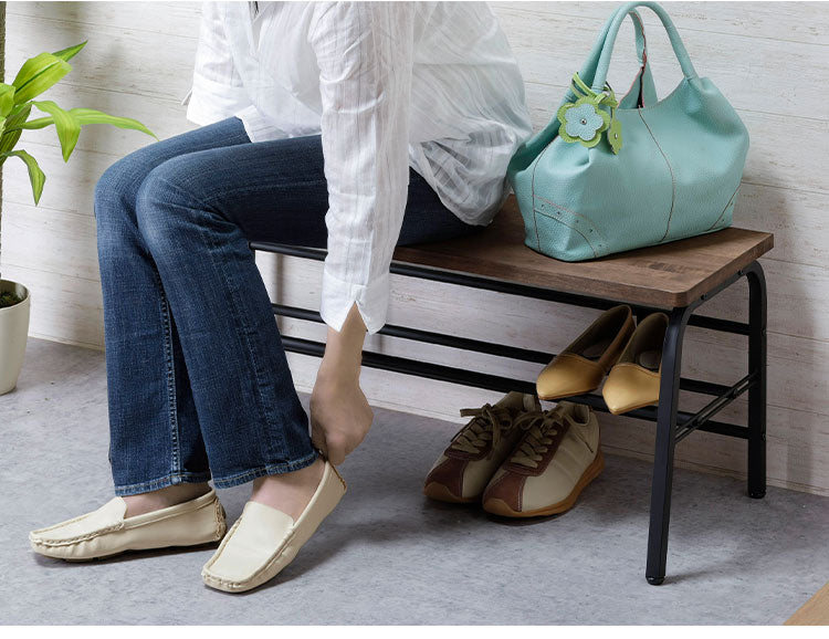 玄関での靴の脱ぎ履きや荷物の一時置きに便利なベンチ。下段には靴を収納できます。ナチュラルな雰囲気のラバーウッドと黒色のスチールで洗練された印象です。靴は約4足収納できます。