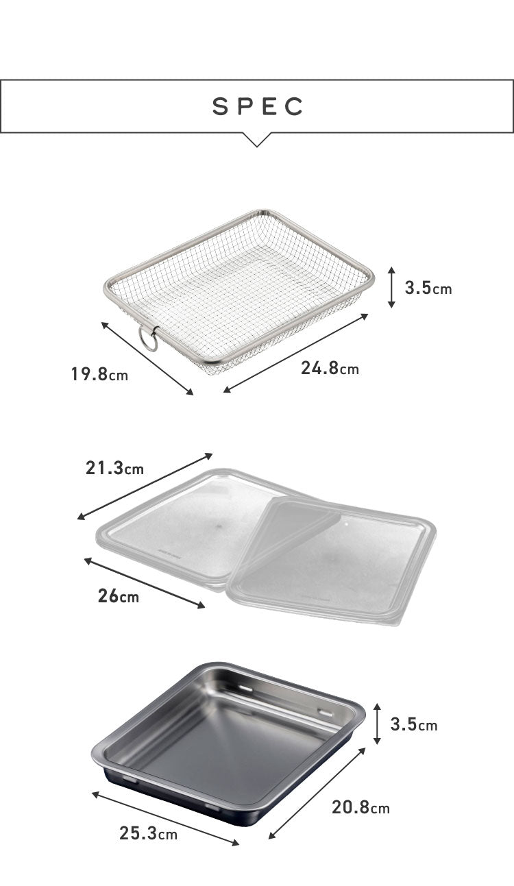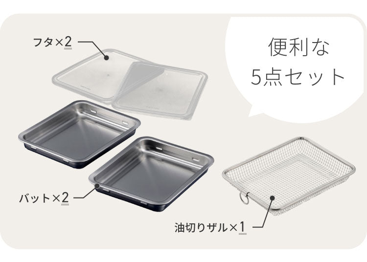 蓋付きステンレスバット、ワイド、フタ付き、ふた付き、バット、ざる、セット、グリルDEカリッとバスケット、温め直し、惣菜、揚げ物、トースター、グリル、下ごしらえ、トレー