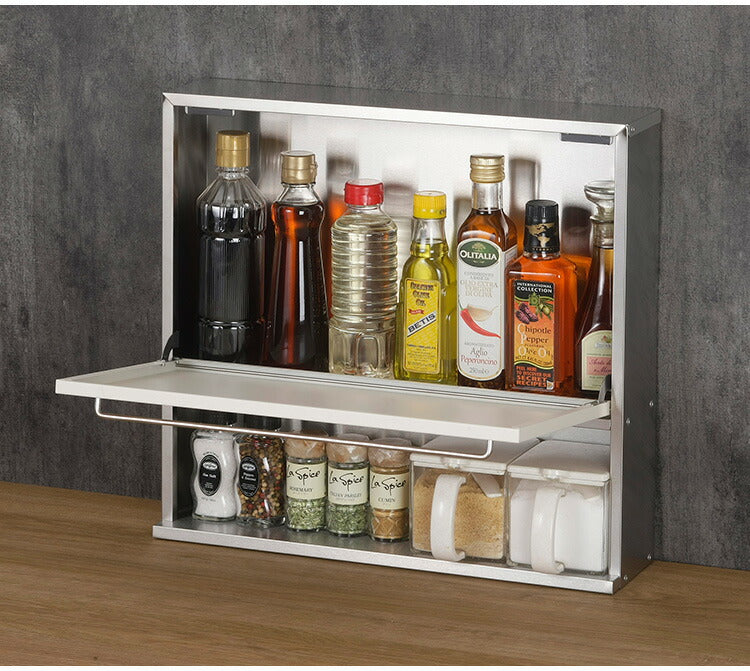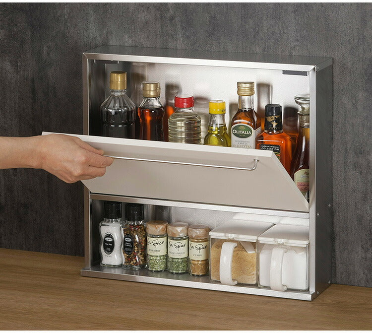 生活感を隠してくれるスパイス&調味料ラックです。扉付きなので乱雑に見えず、容器が油ハネで汚れるのを防ぎます。扉は手前に開くだけのワンアクションでラクです。扉は約80度で止まります。つや消しステンレス×つや消し塗装でシックな雰囲気です。塗装の扉は油汚れが目立ちにくくお手入れがラクです。マグネットが付くのでメモ紙やキッチンタイマーなどの定位置にできます。