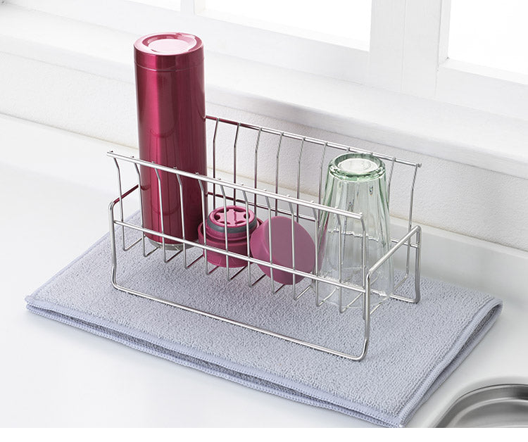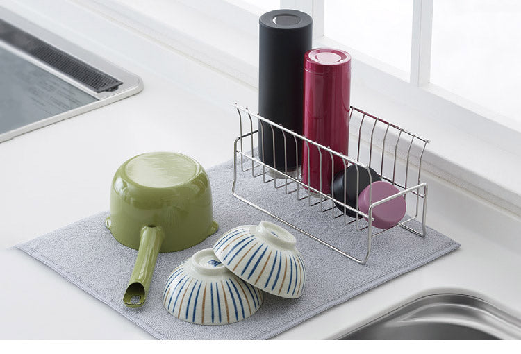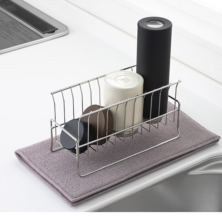 マイボトルを洗った後、または収納場所として使える水切りカゴ。ボトルのフタなど付属品も一緒に置いて水切りできます。