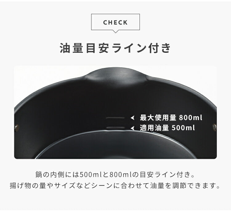ボリュームのあるカツやエビ、魚のフライ等も余裕をもって調理でき、使用後はコンパクトに収納できる小判型ボディです。