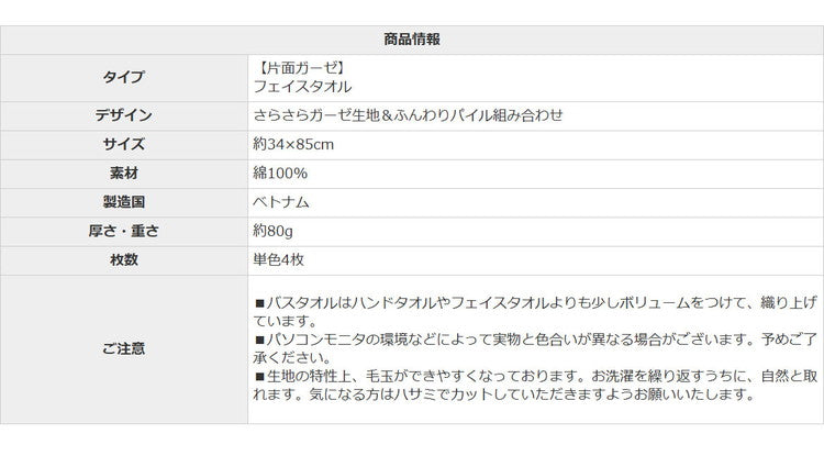 ガーゼフェイスタオル4枚 ガーゼタオルフェイスタオル 4枚セット 全10色 薄手 34×85cm 片面ガーゼ タオル しっかり吸水 速乾 無地 コンパクト ベビー 赤ちゃん まとめ買い(代引不可)