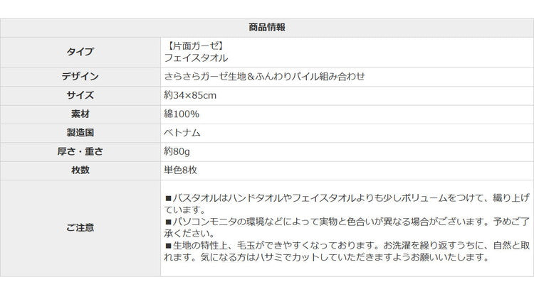 ガーゼフェイスタオル8枚 ガーゼタオルフェイスタオル 8枚セット 全10色 薄手 34×85cm 片面ガーゼ タオル しっかり吸水 速乾 無地 コンパクト ベビー 赤ちゃん まとめ買い(代引不可)