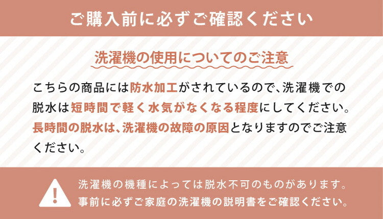 ※こちらの商品には防水加工がされているので、洗濯機での脱水は短時間で軽く水気がなくなる程度にしてください。長時間での脱水は、洗濯機の故障の原因となりますのでご注意ください。