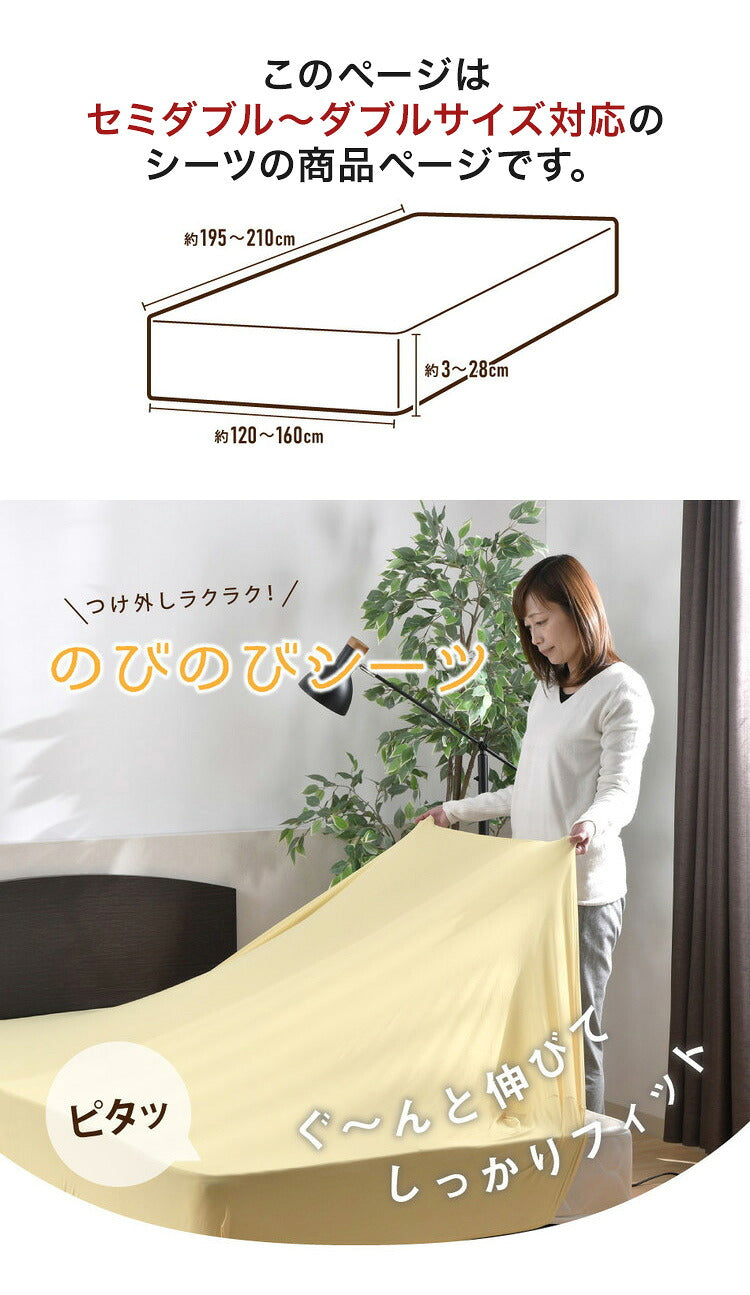 よく伸びるシーツなので、セミダブル~ダブルサイズの寝具に対応しています