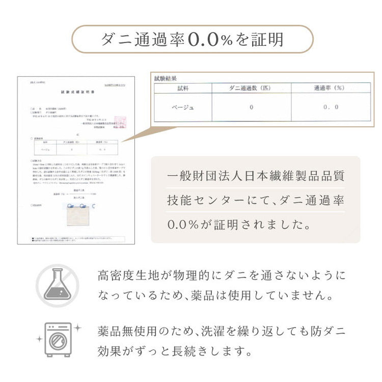ダニが通過できない高密度の生地で、薬剤を使うことなくダニを防ぎます。