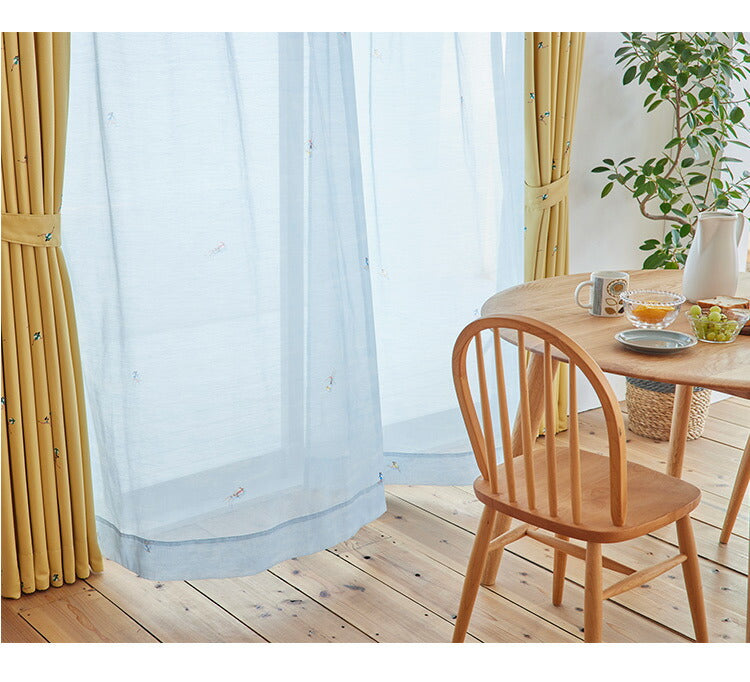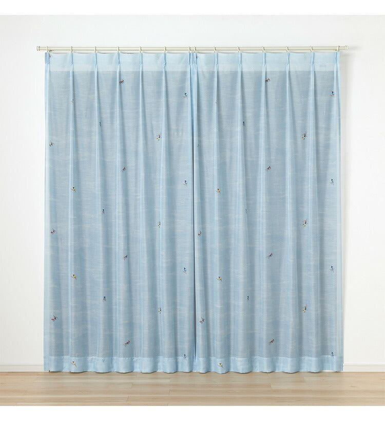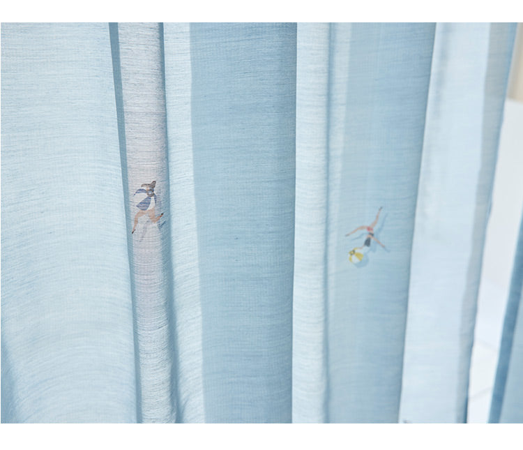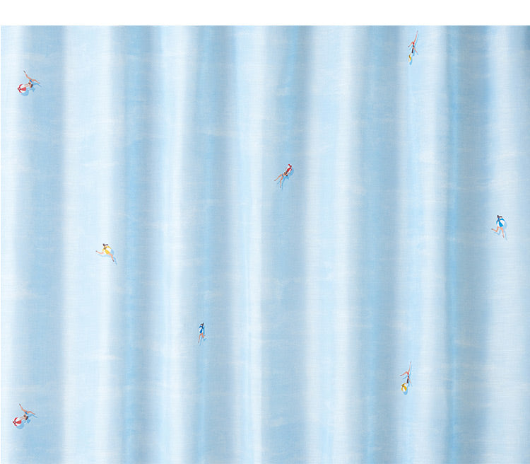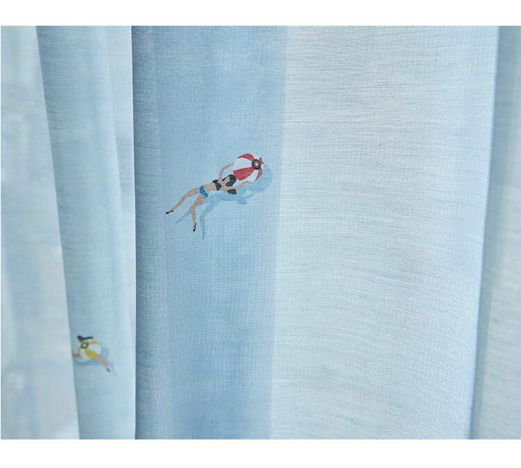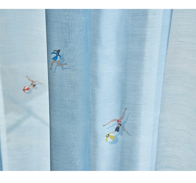 ビーチガールが、カーテンヒダの波間にたゆたうシアーカーテンです。テクスチャーを付けてブリントしたブルーのカラーボイルは、水面や空を連想させます。アート感覚でお部屋を彩るアイテムです。