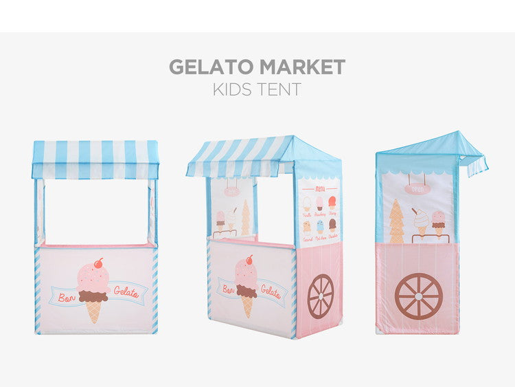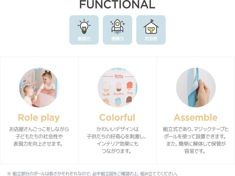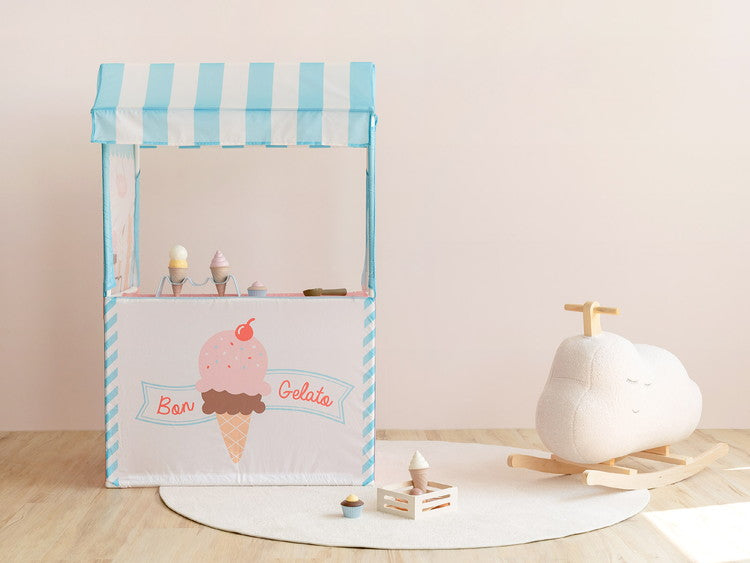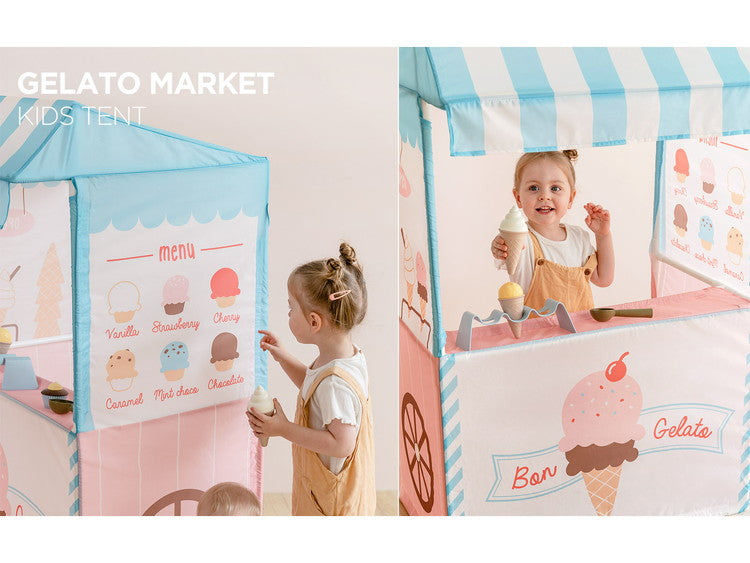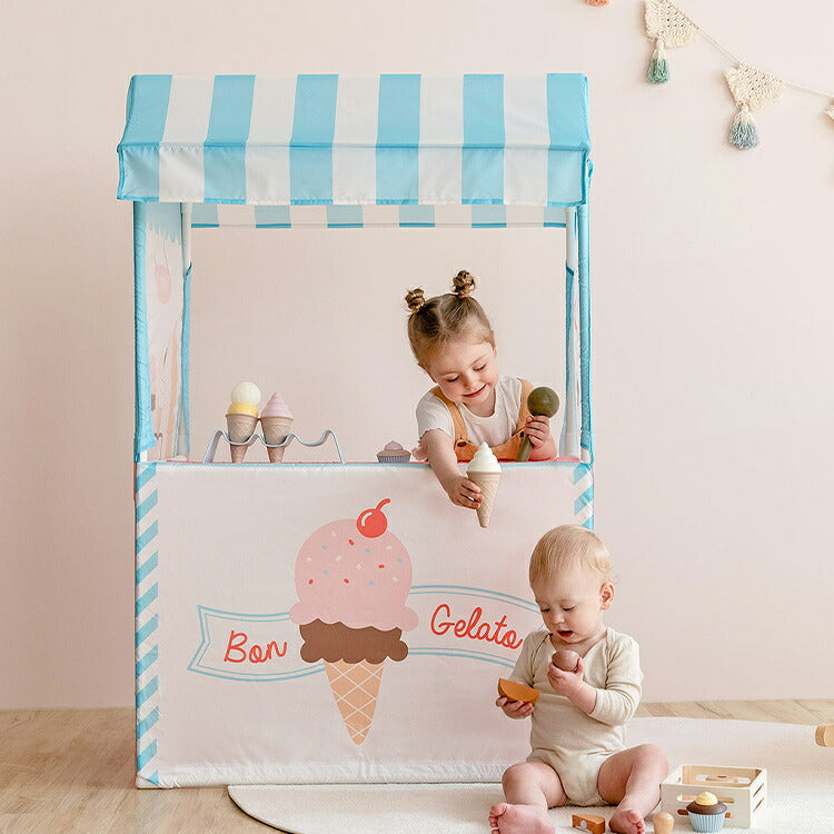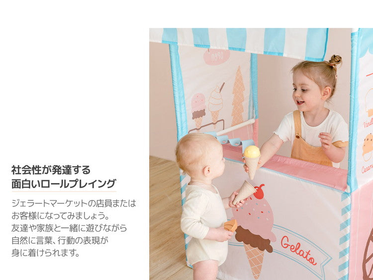 【社会性】 リアルな造形のジェラートマーケットテントでのおままごとは子供たちの社会性と言語能力、表現力の教育を手伝います。