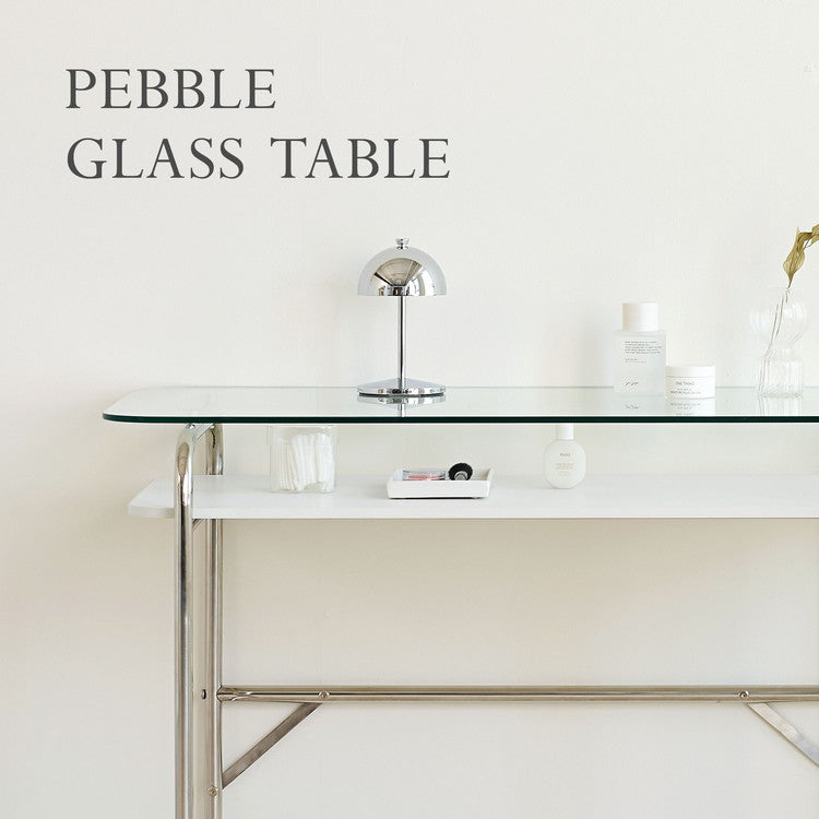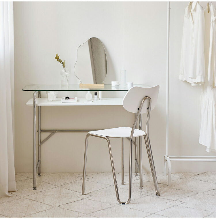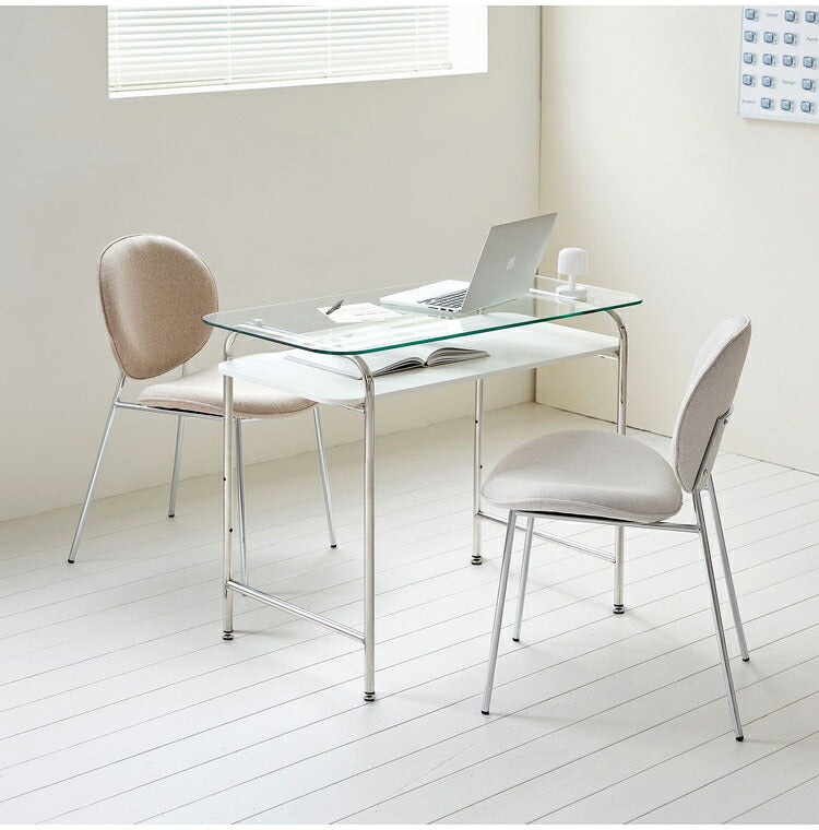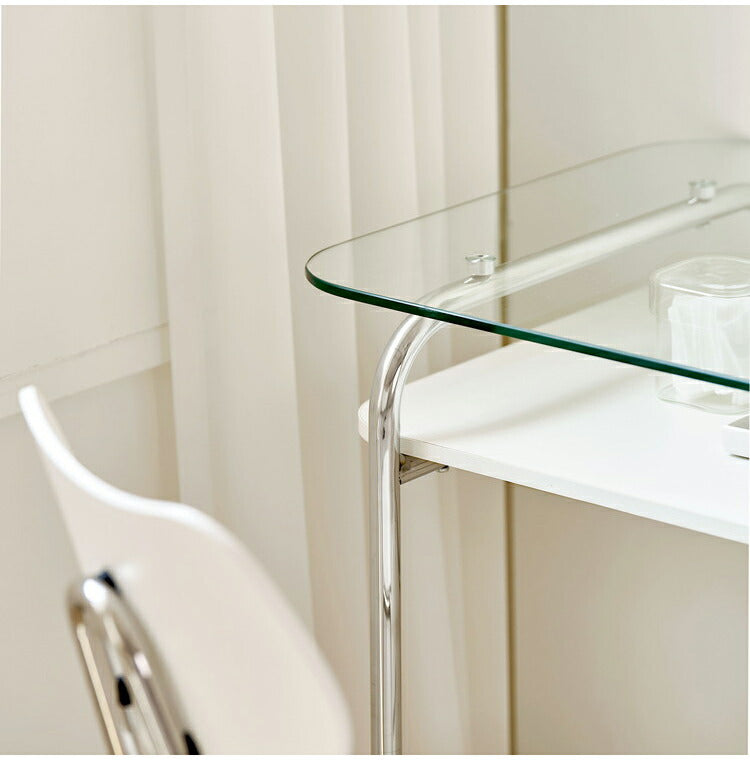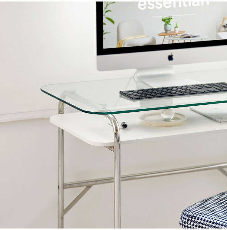 透明なガラス、ホワイトの棚、ステンレスで調和のとれたミッドセンチュリー調のガラスデスクです。