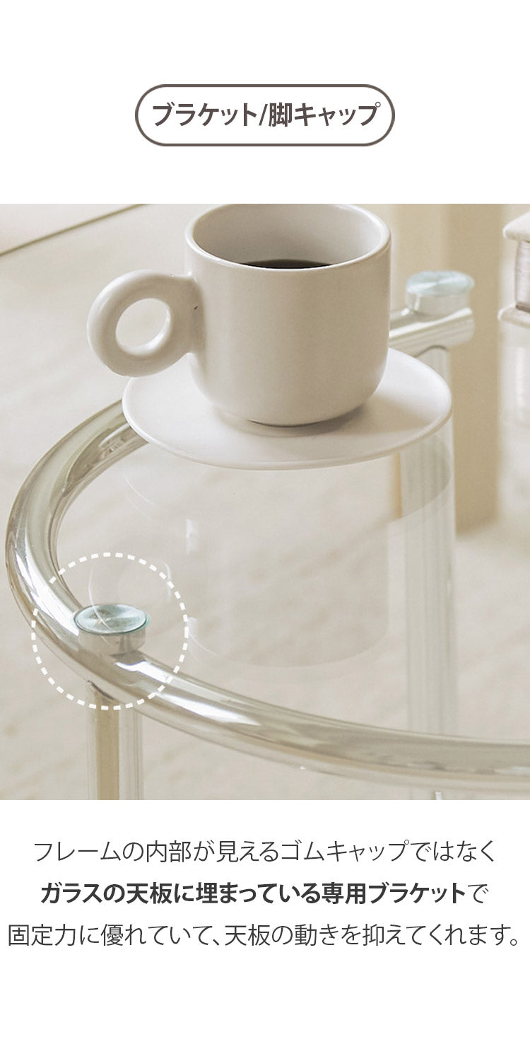 丸いフォルムのお洒落なガラステーブルです。