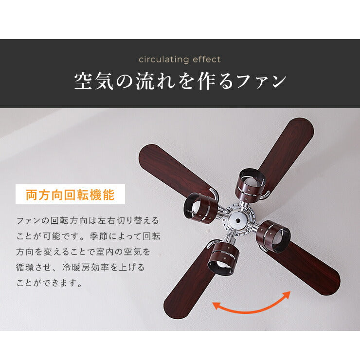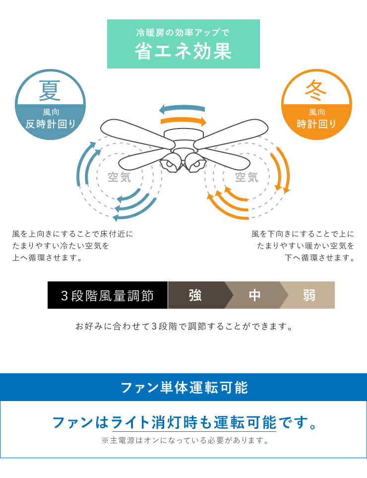 暖房時は天井付近にたまった暖気を下向きに循環、冷房時は床付近にたまった冷気を上へ循環させてくれるので必要以上にエアコンに頼る必要なし。