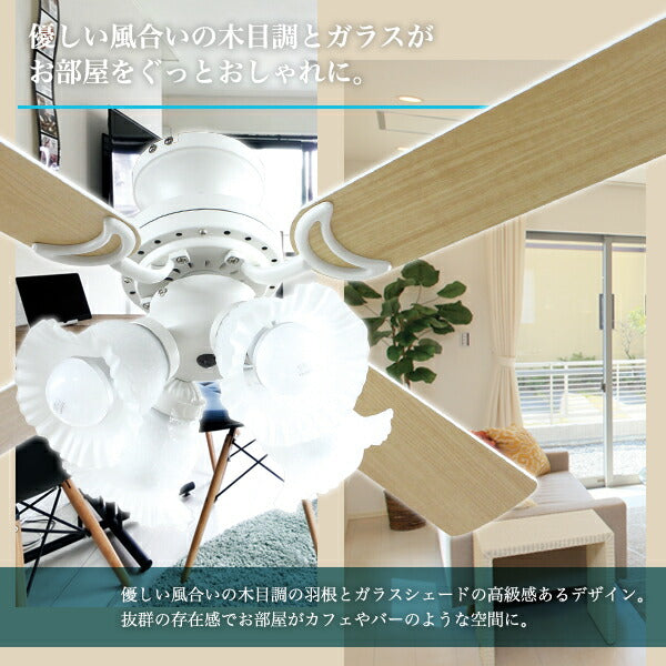 優しい風合いの木目調の羽根とガラスシェードがお部屋をぐっとおしゃれに。