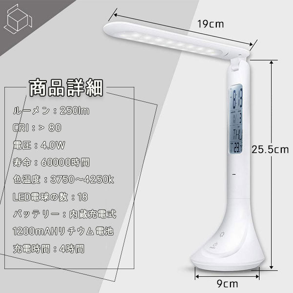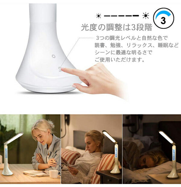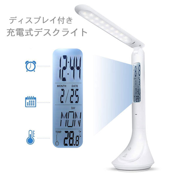 デスクライト 充電式 温度計付き カレンダー機能 アラーム機能 タッチライト 3段階設定 ベットライト スタンドライト TD7027-WH