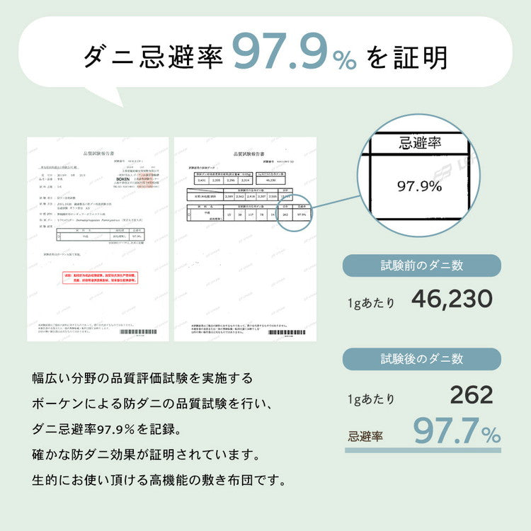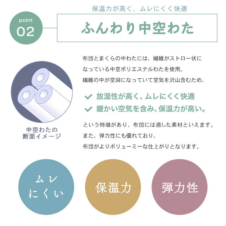 またダニの発生を抑制する効果も高く「抗菌・防臭・防ダニ」のトリプル効果がある高機能わたです!衛生的で、お子様にも安心。