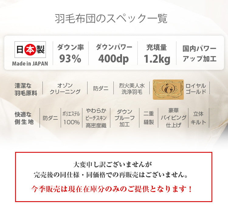 日本製 羽毛布団 羽毛ふとん 増量 1.2kg ホワイトダックダウン 93% 防ダニ 超やわ生地 シングルロング パイピング有り 国産 400dp以上 掛け布団 掛布団 立体キルトロイヤルゴールドラベル