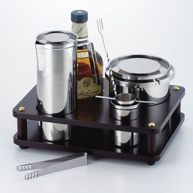 清潔感と高級感のあるステンレス製のウォーターポットとアイスペールにメジャーカップ・バースプーン・スタンドを木台にセットしました。大人のリラックスタイムを演出します。晩酌からパーティーシーンまで幅広く活躍します。