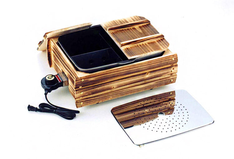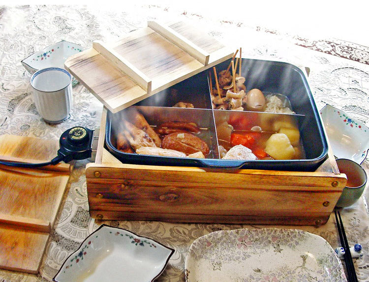 材質/本体・蓋:焼杉風木枠、内鍋:アルミ鋳造(フッ素樹脂加工)、目皿:ステンレス、仕切:アルミ、コードの長さ/約1.4m、消費電力/100V/1,200W、サイズ(重量・容量)/本体:約387×280×140mm(2,630g・6,500?)、木蓋込み高さ:180mm、日本製