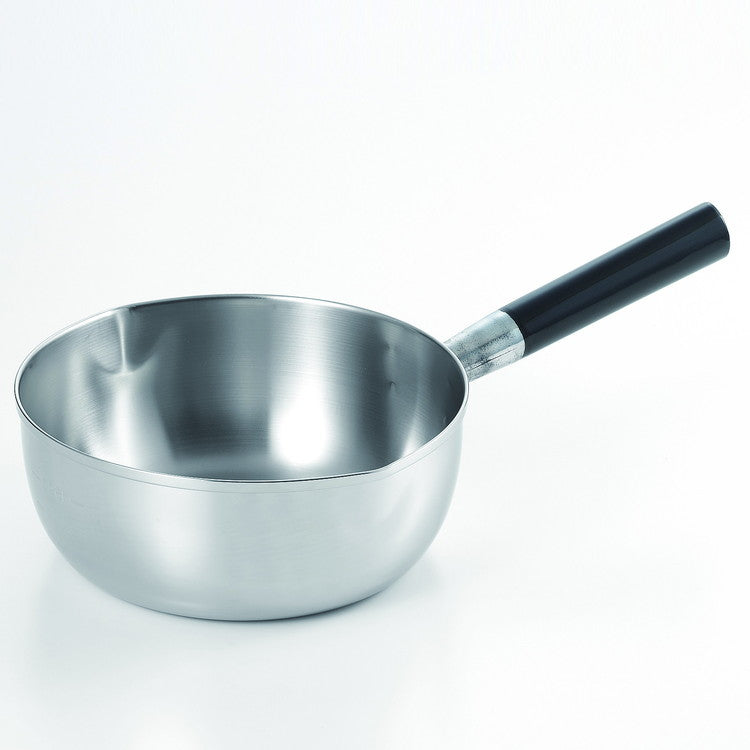注ぎ口が左右両方に付いているので、盛り付けしやすくこぼれにくい鍋です。本体は、外面を錆びにくく丈夫な18-10ステンレス鋼、内側に有磁性を持ち熱伝導に優れた鉄をはさみこんだ全面三層鋼です。貼り底タイプと違い、底部のハガレを気にすることなく使え、耐久性に優る文字通り「プロ仕様」の行平鍋です!また、ハンドルが上に向いて持ちやすくなっているので火元から遠く持ちやすくなっています。内側は容量の目安になる目盛付ですので出汁やスープを作る時の分量が確認しやすくなっています。