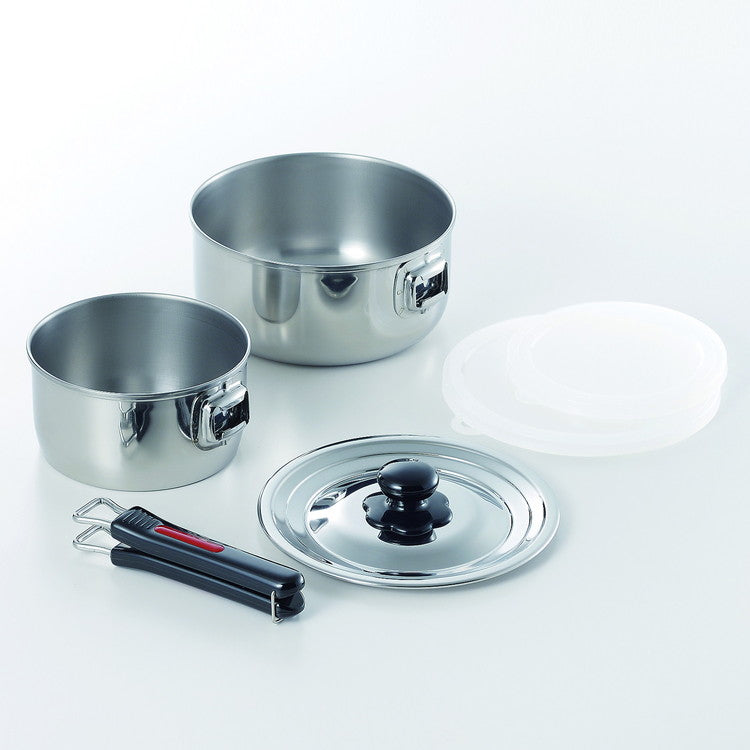 着脱式ステンレス製、14、18cmの取っ手の取れる鍋2点セット。ハンドル着脱式なので場所も取らず重ねて収納できる。シール蓋付なのでお鍋がそのまま保存容器として使えます。内側のコーティングが無いので、洗う際ごしごしこすれます。
