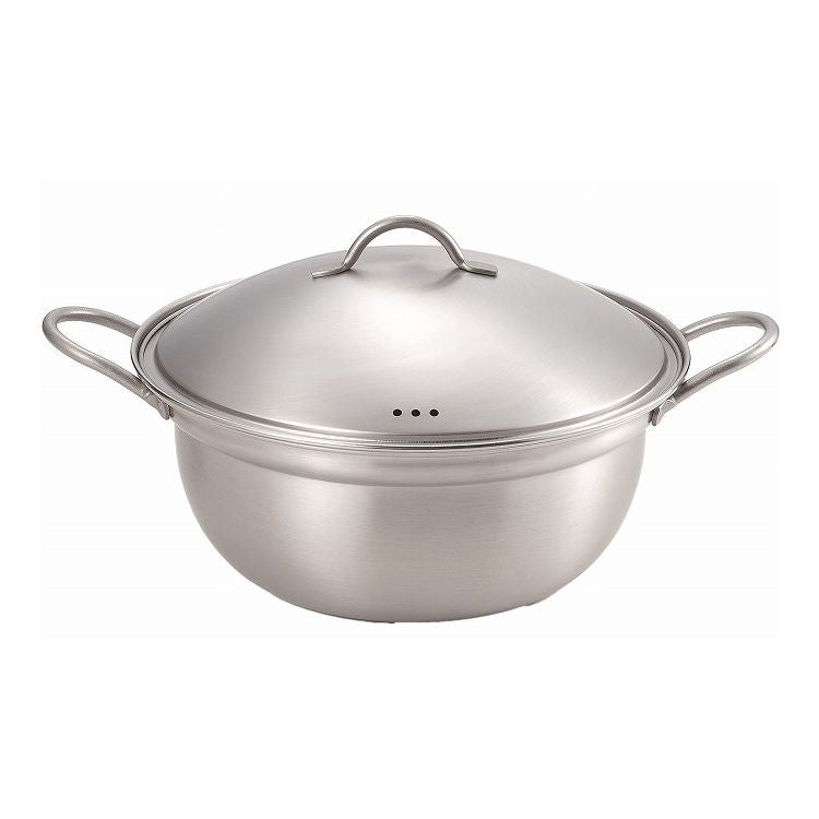 ステンレス製の寄せしゃぶ鍋。継ぎ目が少なくお手入れしやすい。卓上でくつくつと煮込むのにピッタリです。共柄タイプですので劣化しにくく丈夫です。