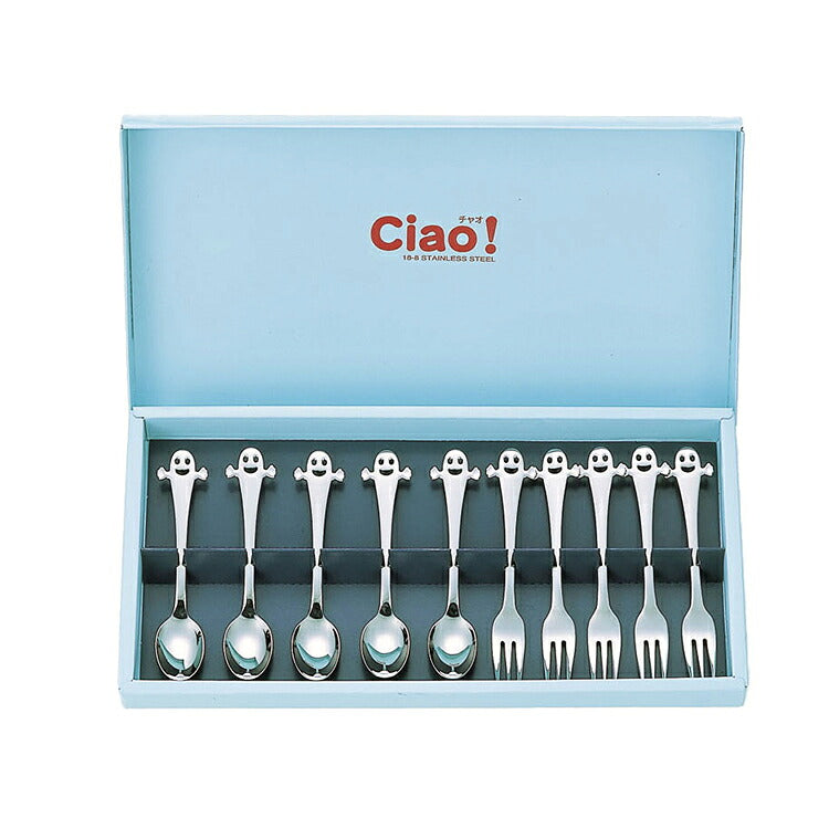 材質/コーヒースプーン:18-8ステンレス、ヒメフォーク:21ステンレス、セット内容/コーヒースプーン・ヒメフォーク×各5、サイズ(重量)/コーヒースプーン:約25×128×15mm(16g)、ヒメフォーク:約25×133×12mm(15g)、日本製