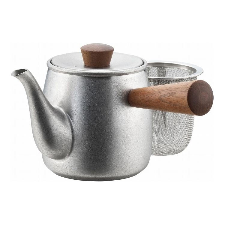 ざらめ急須は、表面に小さな凹凸を施しアンティークな質感を表現しています。シックな色合いの本体はモダンな室内にも調和します。ちょっと飲むのにちょうどいい、お茶1~2杯分くらいの大きさです。「茶き 急須」は色うつりやにおいがつきにくいステンレス製のため、種類豊富で色々な味わいを持つ日本茶を1つの急須で楽しめます。愛着を持って長く使っていただける、一生モノのアイテムです。