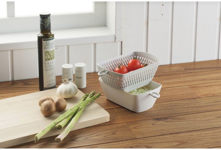 まな板の上で切った食材をサッと「チリトリ」できる、ザルとボウルのセットです。場所を取らずに積み重ねできる「カク」タイプだから、お料理の下ごしらえに大活躍!目盛り付きで計量にも使えます。電子レンジ、食器洗い乾燥機OK!