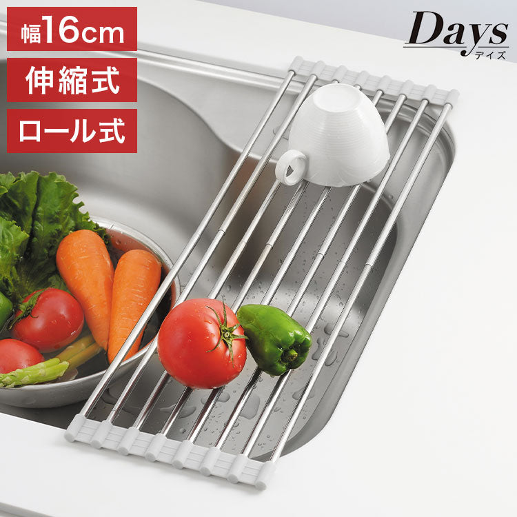 水切りラック シンク上 スリム 幅16cm 伸縮 27.5~45cm ステンレス シリコン 折りたたみ シンク横 大容量 コンパクト くるくるスッキリラック 錆びない 食器 プレート 伸縮式 巻ける 省スペース(代引不可)
