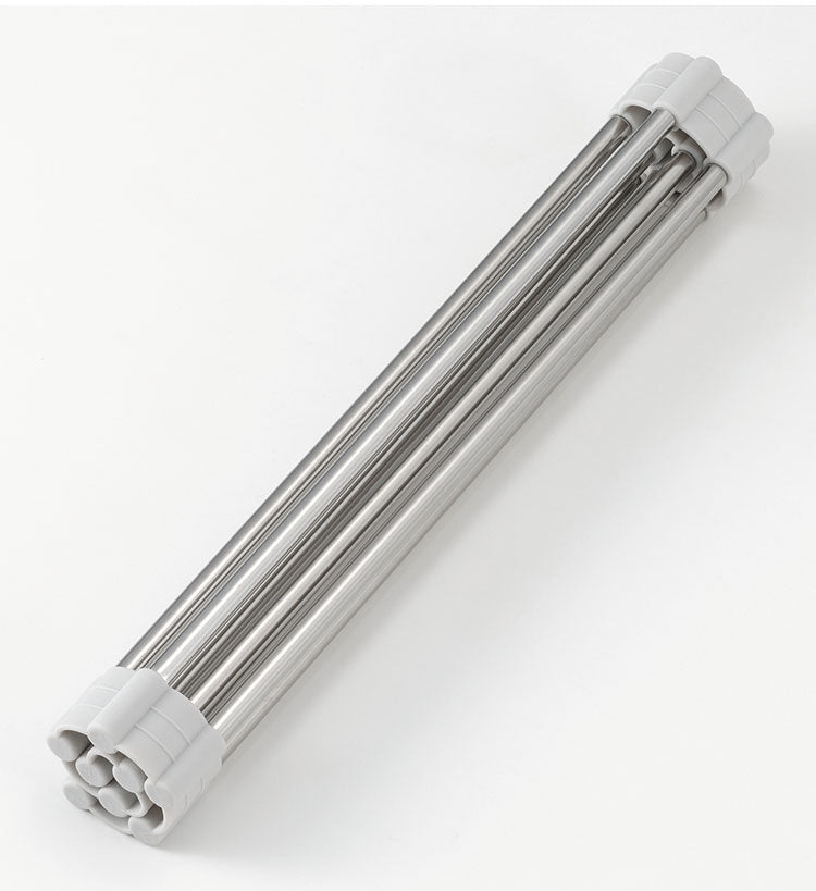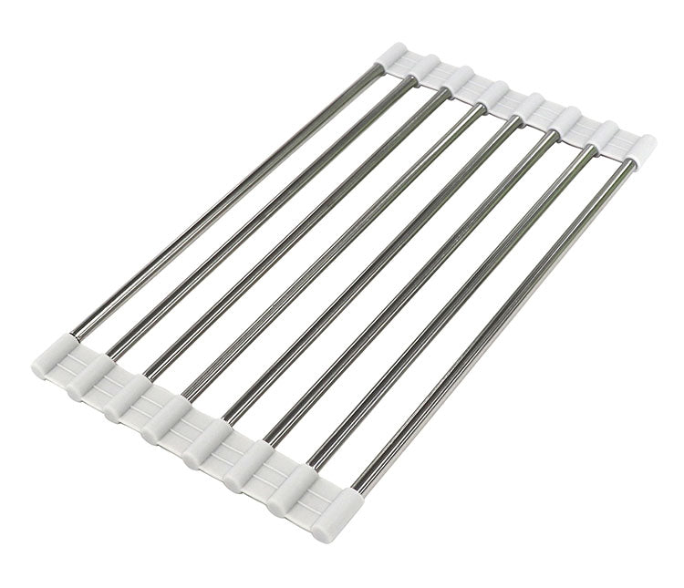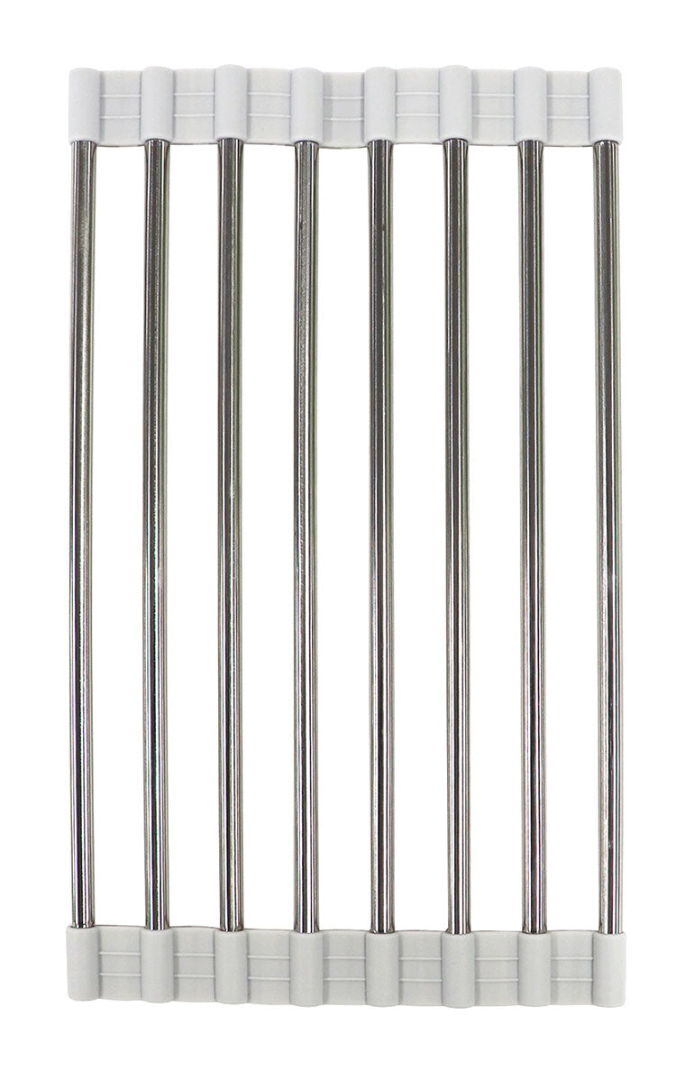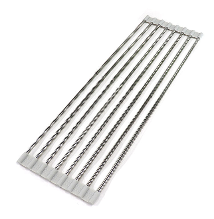 シンクに渡して水を切ることができるラックです。本体はステンレス製で錆びにくいため水まわりに適します。伸縮させることができ、シンクの幅に合わせて調節できます。フチはシリコン製のため滑りにくくシンクのフチにフィットします。使わないときは巻簾状にできるのでコンパクト。