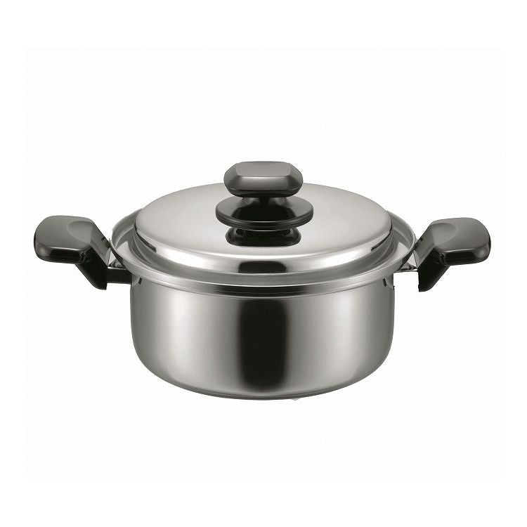 本体と鍋の間に水の膜が貼る「ウォーターシール効果」により、吹きこぼれしにくい鍋です。ご家庭で扱いやすい丁度いいサイズ。食材のうま味を閉じ込めるので、料理をおいしくヘルシーに仕上げます。油も水分も少なく済み、調理時間も短縮できるので経済的です。お手入れのしやすいステンレス製。鍋の特長を活かした料理レシピ付!ガス火・IH電磁調理器100V・200V対応。