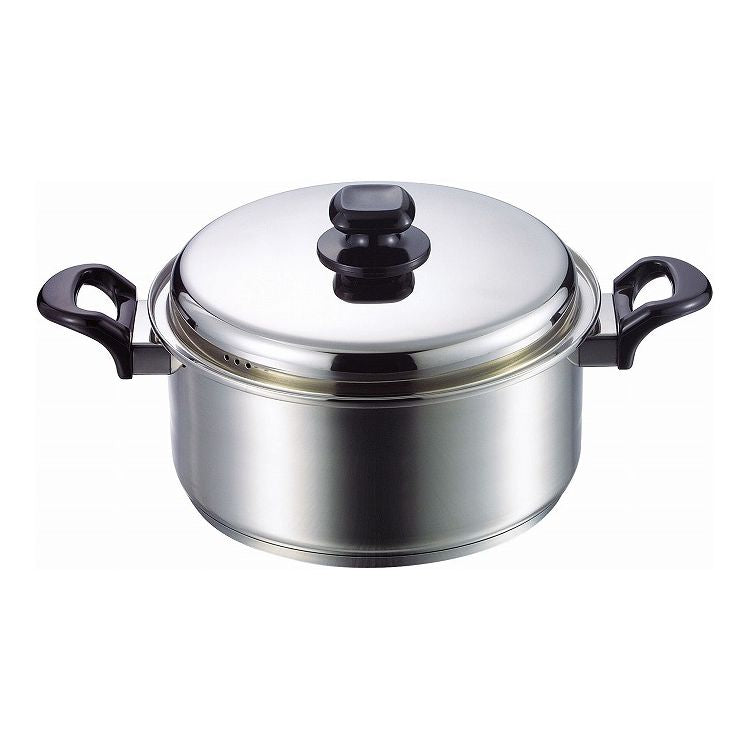 内面ミラー仕上げで料理がこびりつきにくく、お手入れ簡単なステンレス鍋です。18-8ステンレス鋼のボディはサビに強く衛生的。ガス火・IH電磁調理器100V・200V対応。