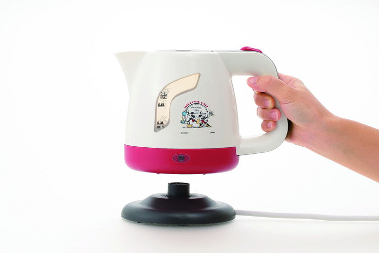 ミッキー&ミニーがウエイターとウェイトレス姿で登場!!艶消し仕様で大人の雰囲気と懐かしさがあるヴィンテージティスト。大き目の窓で水量を確認しやすい電気ケトル。キッチンではもちろん、リビングやオフィスでも欲しい分だけ手早く沸かせます。沸騰すると自動的に電源が切れるので無駄な電気を使いません。本体はコードレスタイプなのでお湯を注ぐ際にコードが絡みません。