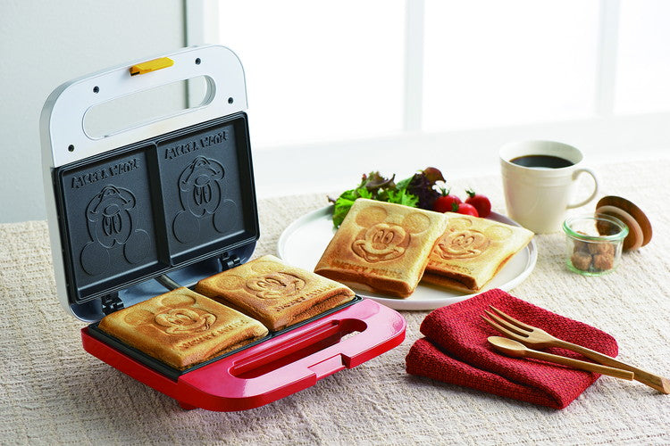 ちょっぴりレトロで快活なデザインの調理家電。焼き面にキュートなフェイスマークがつくのがポイント!出来立てアツアツをモーニングに、ランチに取り入れて!プレートはフッ素加工なので、布巾などでサッと拭くだけの簡単お手入れです。ホットサンドにミッキーのフェイスマークがつきます。ひょうきんな表情がなんとも言えません。
