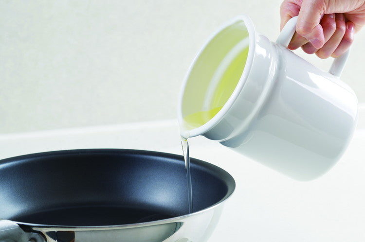 琺瑯製のオイルポット。使用済みの油を、漉しアミで揚げカスを除去して保管ができます。揚げカスを取り除き酸化を防ぐことで油の鮮度を保ちます。琺瑯の表面はガラス質でツルツルしているため、汚れを落としやすくお手入れが簡単に行えます。天ぷらや揚げ物に使用した油を濾して再利用することができます。