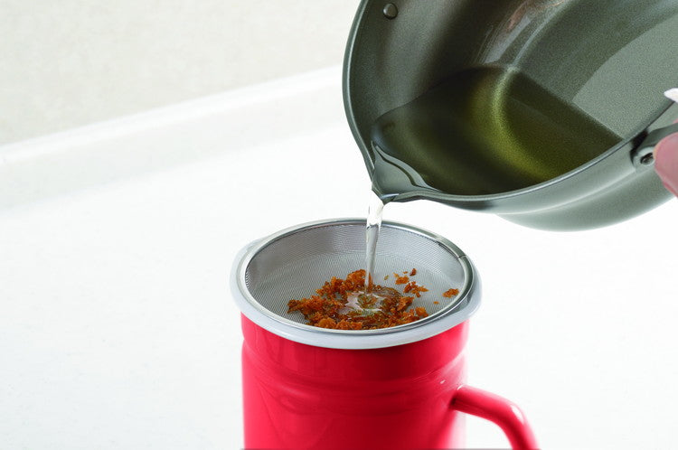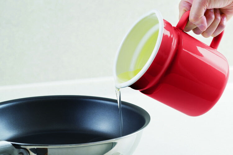 琺瑯製のオイルポット。使用済みの油を、漉しアミで揚げカスを除去して保管ができます。揚げカスを取り除き酸化を防ぐことで油の鮮度を保ちます。琺瑯の表面はガラス質でツルツルしているため、汚れを落としやすくお手入れが簡単に行えます。天ぷらや揚げ物に使用した油を濾して再利用することができます。