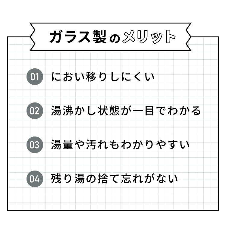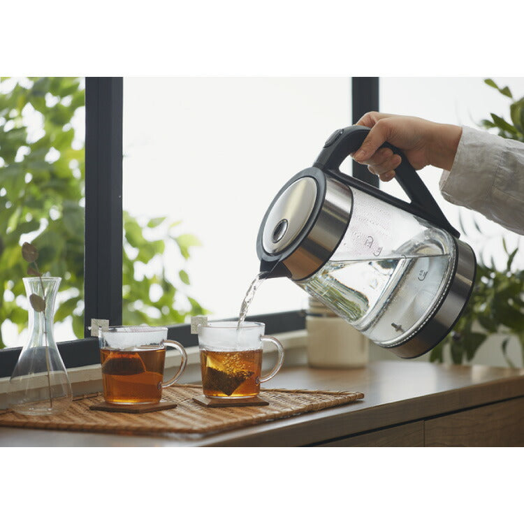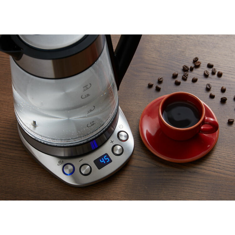 ■商品説明飲み物の種類に合わせて5℃ずつの温度調整が可能。温度調整付なので、様々なシーンに合わせてご使用いただけます。キッチンではもちろん、リビングやオフィスでも欲しい分だけ手早く沸かせます。沸騰すると自動的に電源が切れるので、無駄な電気を使いません。コードレスタイプなのでお湯を注ぐ際にコードが絡みません。本体はガラス製のため、沸き具合がわかりやすい。ケトル内の水量が分かりやすいメモリ付。フタはワンタッチでラクラクオープン。使わないときも圧迫感がなく、生活に馴染みます。
