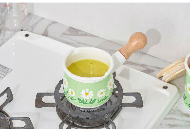 材質/本体:ほうろう用鋼板(ほうろう加工)、底の厚さ0. 6mm、木部:天然木、サイズ(重量・容量)/約195×103×88mm(約260g・550ml)、日本製(本商品は下地は中国国内で、絵付けから仕上げまでの完成工程を日本国内)