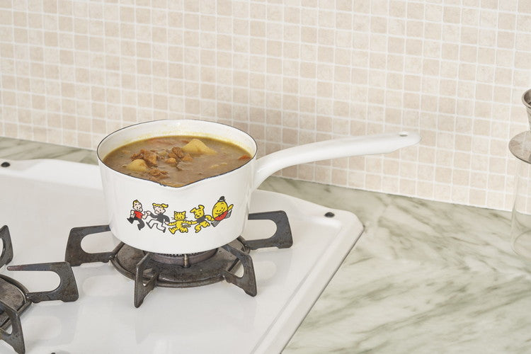 ジャック・ジル・キャット・ドッグ・ハンプティダンプディが仲良く手をつないだイラストデザイン。レトロテイストの色合いが白い琺瑯の地によく映えます。両側注ぎ口付きで利き手を気にせず注げます。2~3人用の大きさです。ミルクの温め、レトルト食品の温めなどに!表面がガラス質のため、金属が溶出せず食材の味を変えないことから、ジャム作りや離乳食の調理に適しています。
