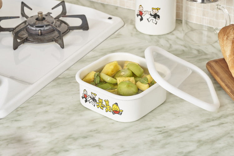 ジャック・ジル・キャット・ドッグ・ハンプティダンプディが仲良く手をつないだイラストデザイン。レトロテイストの色合いが白い琺瑯の地によく映えます。ホーローはにおい移りしないため、食品の保存に適します。作り置きのおかずや、ごはんのお供など。調味料ストッカーとしても好まれます。