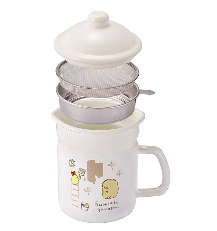 のんびり過ごしている姿を柔らかいタッチで描きました。カジュアルでかしこまらない、そして毎日使えるすみっコらしい 大人のためのデザインシリーズです。使用済みの油を、漉しアミで揚げカスを除去して保管ができます。揚げカスを取り除き酸化を防ぐことで油の鮮度を保ちます。琺瑯の表面はガラス質でツルツルしているため、汚れを落としやすくお手入れが簡単に行えます。