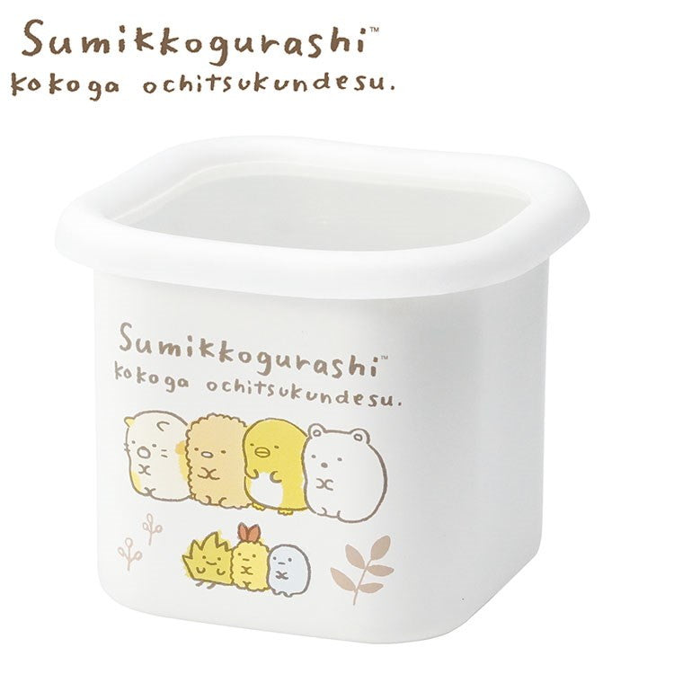 のんびり過ごしている姿を柔らかいタッチで描きました。カジュアルでかしこまらない、そして毎日使えるすみっコらしい 大人のためのデザインシリーズです。ほうろうは酸に強くてにおい移りの心配が少ないので、常備食の保存にも最適です。角型タイプなので積み重ねたり、横に並べたときもムダなすき間ができにくく収納スペースを有効に使えます。