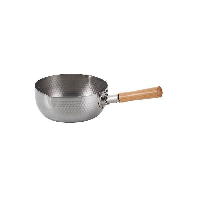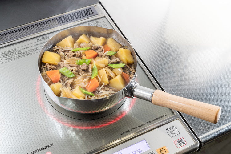 雪深い越後人が生み出した技で作り上げた鍋、天然木で安定感あるハンドル持ち手、直火からIH調理器にもOK。外観には、手作りあふれるような鎚目仕上げ。天然木で使い込むほど手になじむハイグリップ感覚。木柄カツラ部分も熱源に考慮し長く、木柄止めネジも長く2本止め。
