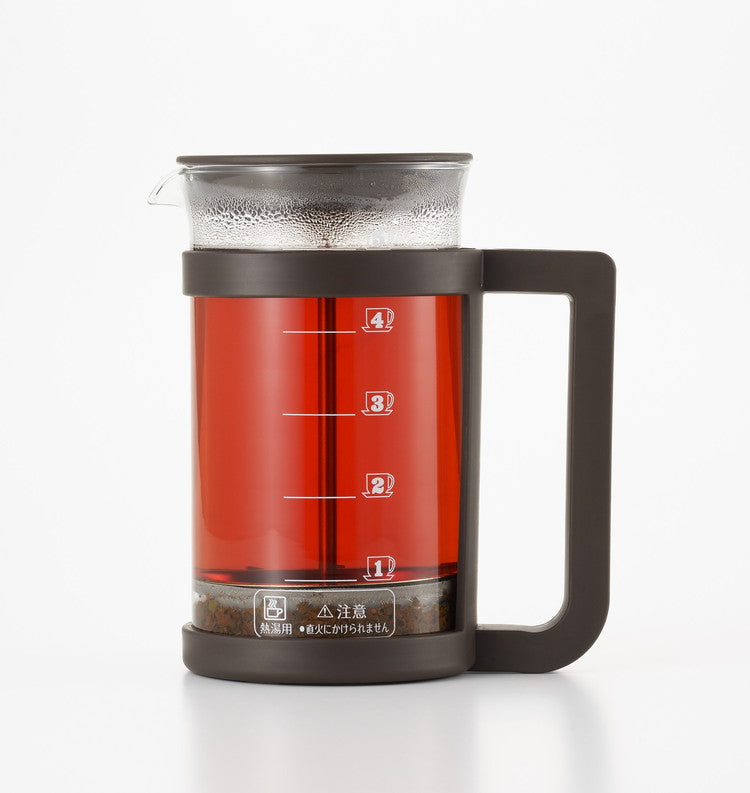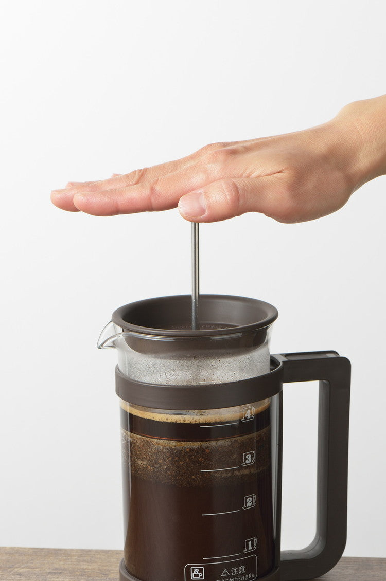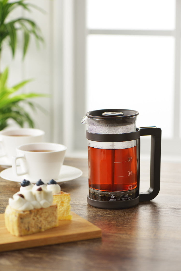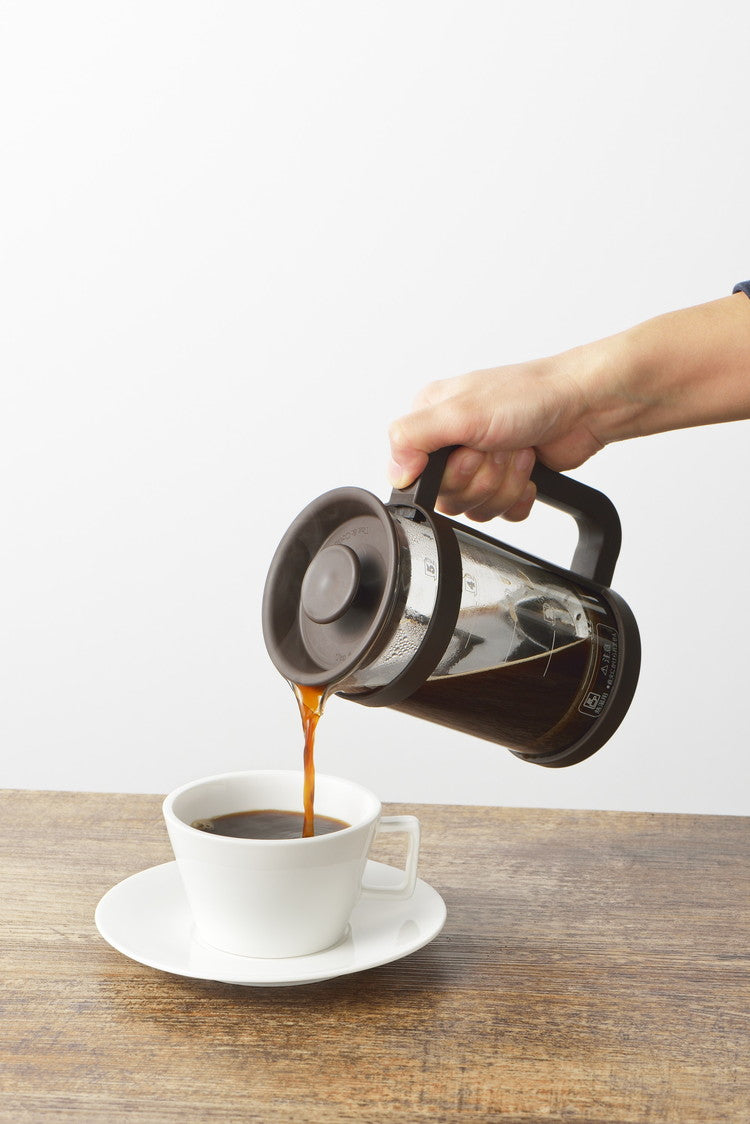 コーヒーや紅茶、緑茶などが楽しめるプレスメーカー。フレンチプレス式のコーヒーの抽出は、容器に入れたコーヒー粉とお湯を金属フィルターで押し込めて抽出します。豆の苦みや香りが多く含まれるコーヒーオイルも抽出するため、ダイレクトな味を楽しみたい方にお勧めです。紙フィルターや布フィルターを使わないことで得られる一味違った本格的な味わいがプレス式の特徴です。お茶の抽出ではティーリーフ(茶葉)がガラス容器内で動いて抽出されるため新鮮な茶葉であればジャンピングが起こしやすくなります。ガラス容器には容量500mlの目盛付。(100ml刻みの目盛です。)ホルダーからガラスポットの取り外しができるため洗浄がしやすい!フィルターは分解して洗うことができます。