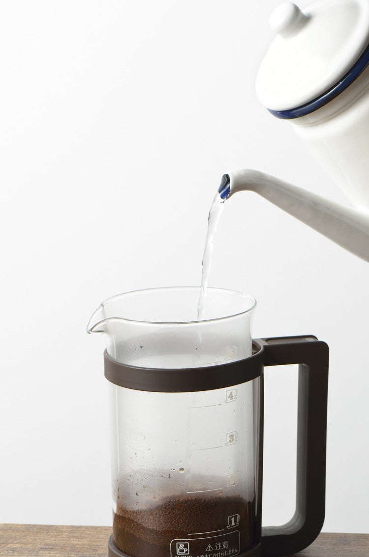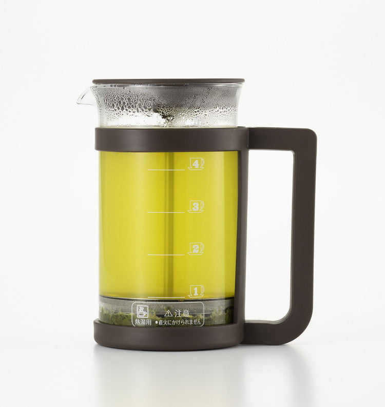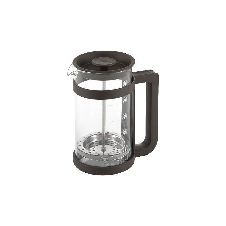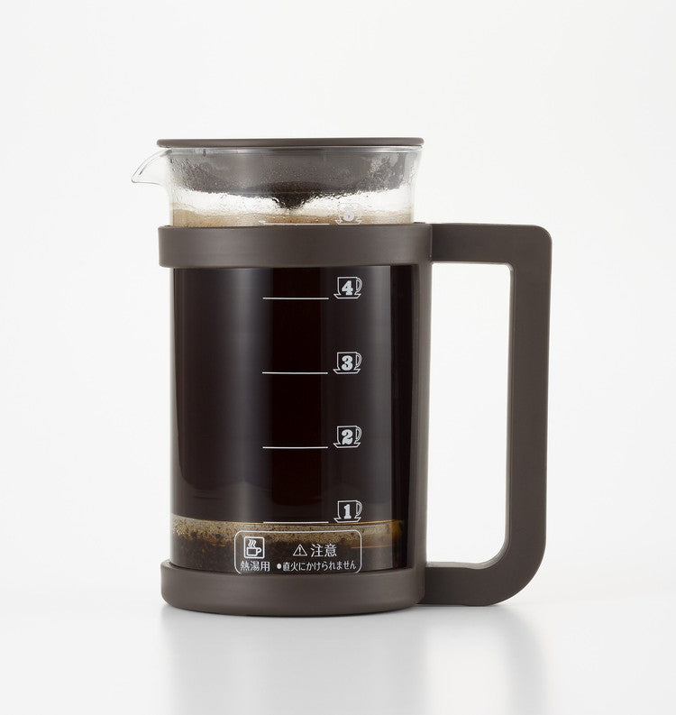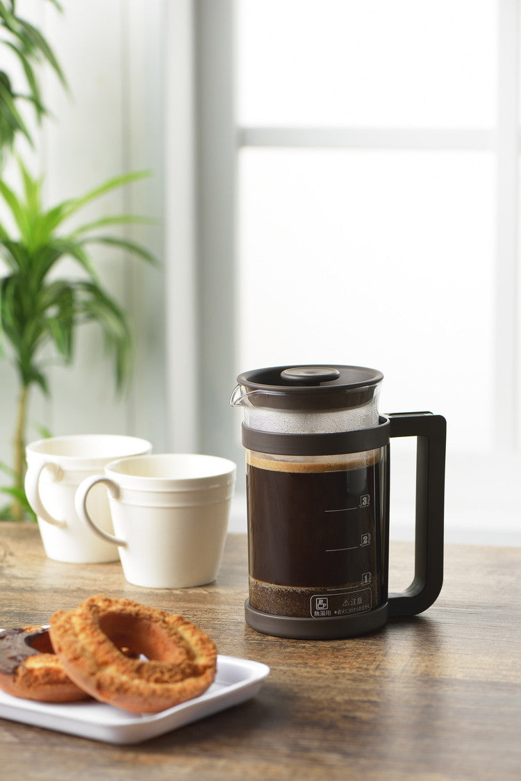 コーヒーや紅茶、緑茶などが楽しめるプレスメーカー。フレンチプレス式のコーヒーの抽出は、容器に入れたコーヒー粉とお湯を金属フィルターで押し込めて抽出します。豆の苦みや香りが多く含まれるコーヒーオイルも抽出するため、ダイレクトな味を楽しみたい方にお勧めです。紙フィルターや布フィルターを使わないことで得られる一味違った本格的な味わいがプレス式の特徴です。お茶の抽出ではティーリーフ(茶葉)がガラス容器内で動いて抽出されるため新鮮な茶葉であればジャンピングが起こしやすくなります。ガラス容器には容量500mlの目盛付。(100ml刻みの目盛です。)ホルダーからガラスポットの取り外しができるため洗浄がしやすい!フィルターは分解して洗うことができます。