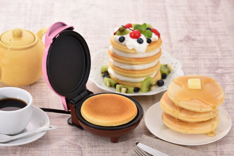 ■商品説明手のひらサイズのパンケーキメーカー。直径10cmのプチパンケーキが約3分で作れます。上下の熱源でひっくり返さず時短調理。プレートはフッ素樹脂塗装でお手入れ簡単。お子様のおやつ、パーティーにおススメです。お好み焼きやマドレーヌなども作れるかんたんレシピ付!■商品仕様