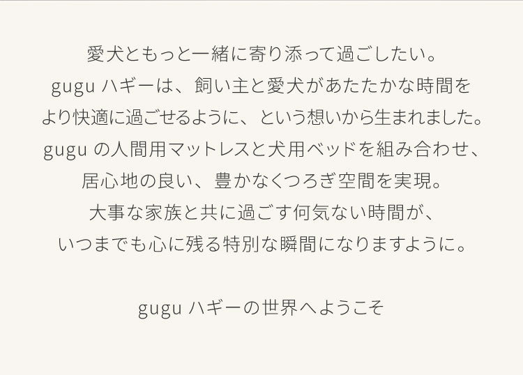 愛犬と一緒にくつろいで過ごせる大型サイズの犬用ベッド。guguハギーで、家族と共に過ごす幸せなひとときを。