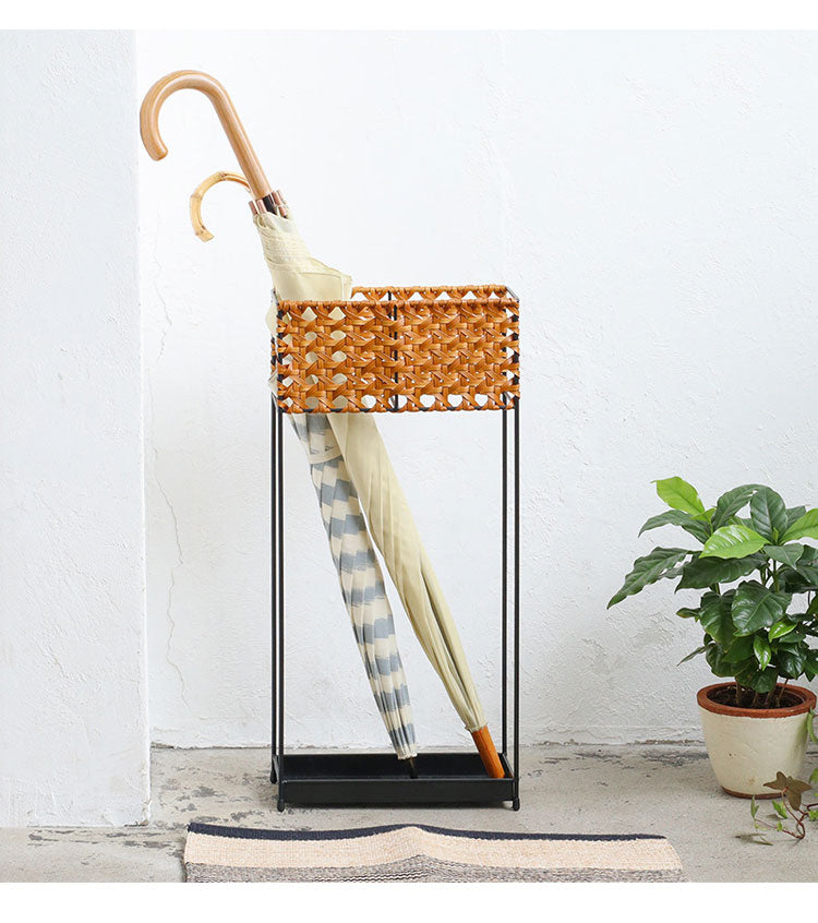 PPラタンとアイアンを組み合わせたシンプルなアンブレラスタンド。 UTILE Octaシリーズにアイアンの脚と組み合わせたアンブレラスタンドが加わりました。 「スリム」は幅約25cm、奥行約11.5cmの最低限の機能を残したシンプルでスリムなスタンドです。 中央にアイアンの仕切りがあるため傘の種類や家族ごとに傘を分けて収納可能。 編み込み部分は水に強いポリプロピレン、ポリエチレンチューブを使って手作業で編まれています。 天然素材のように腐食しないので濡れた傘も気にせず入れられます。 傘は約6本程度収納可能。玄関を広く使いたい方や一人暮らしのお部屋におすすめのスタンドです。