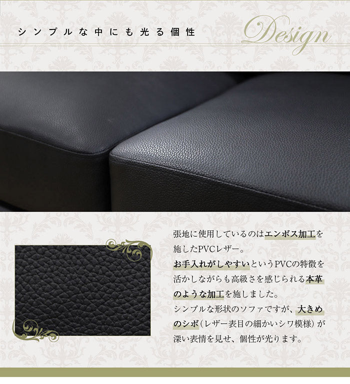 張地に使用しているのはエンボス加工を施したPVCレザー。大きめのシボ(レザー表目の細かいシワ模様)が深い表情を見せ、個性が光ります。